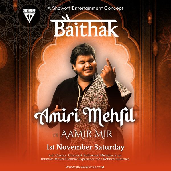 Baithak - A Showoff Entertainment Concept is a specially curated Mehfil featuring Live Sufi Music, Ghazals, Poetry and much more. Each Event in this series is specially curated with different artists and has a blend of Melody, Lyrics, and Composition which creates only Magic which we share with our audience. A concept which caters to the true listeners of Music giving them an intimate experience where they can sing along, simply listen, or simply heal that part of them that was never broken. Our Guests have the option to sit on a baithak style seating on the diwans or on chairs as per their comfort giving every individual a unique experience which is new for the region.